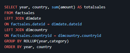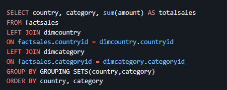 - Requête cumulative utilisant les colonnes pays, catégorie, ventes totales, pour obtenir les ventes totales par pays et par catégorie.